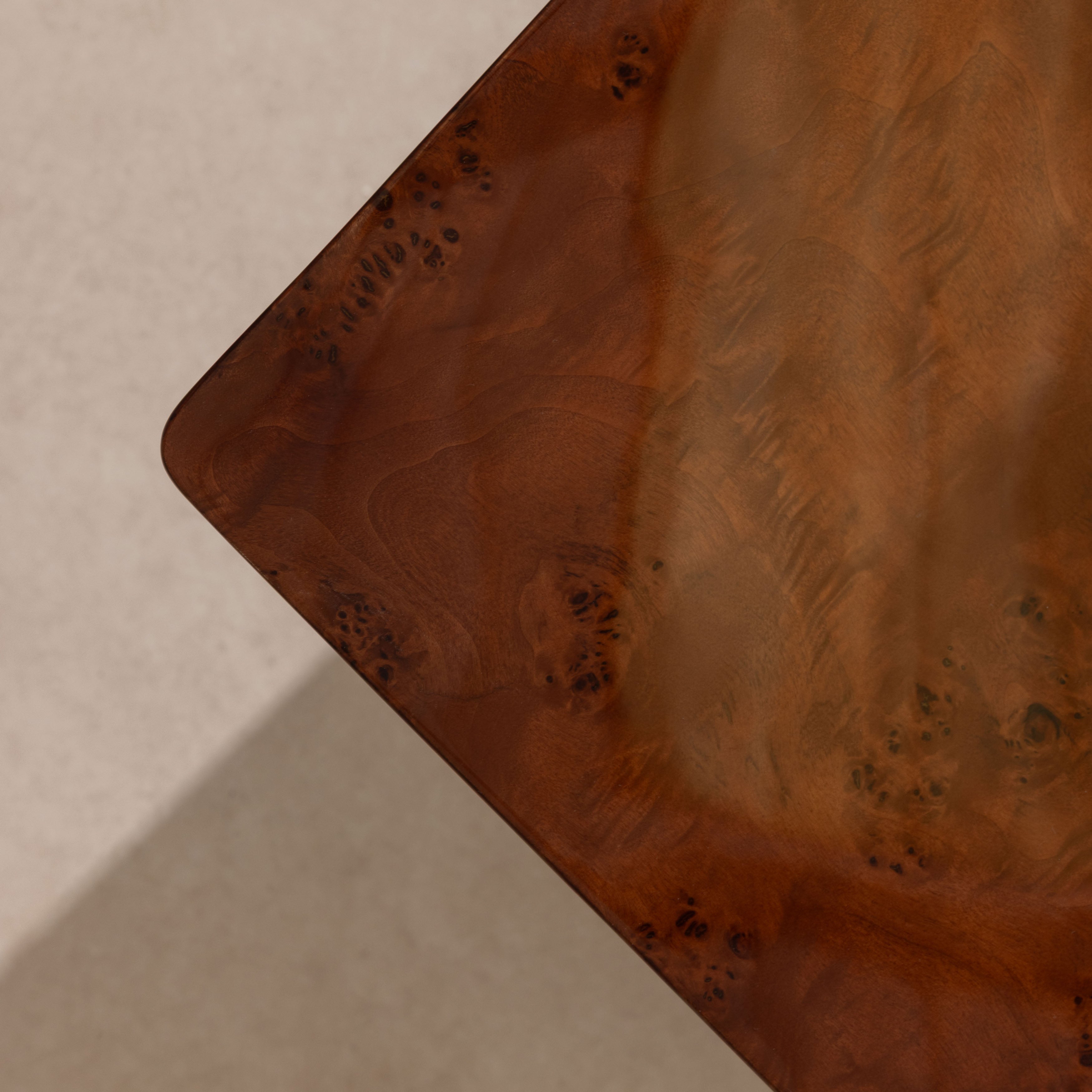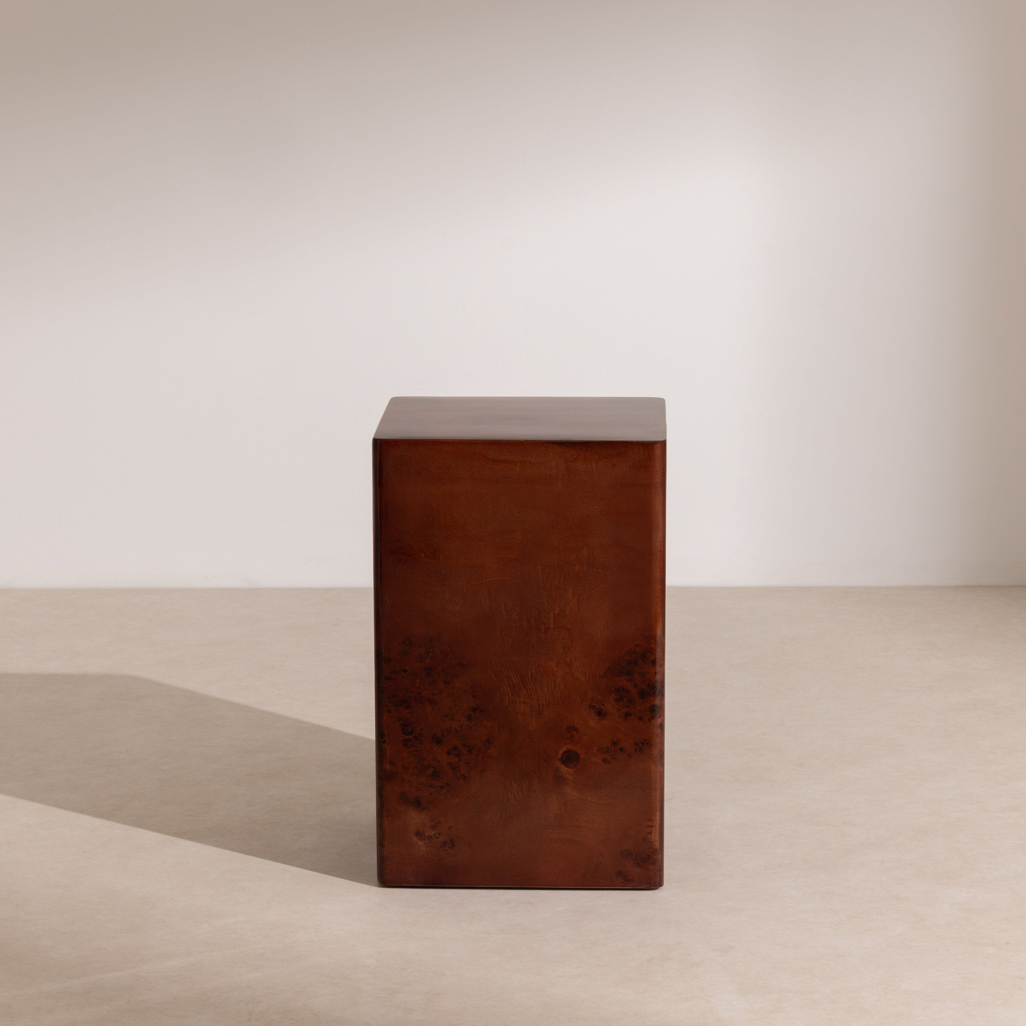 The Burl Plinth Table showcases a simple shape with smooth top, crafted from authentic Burl wood.