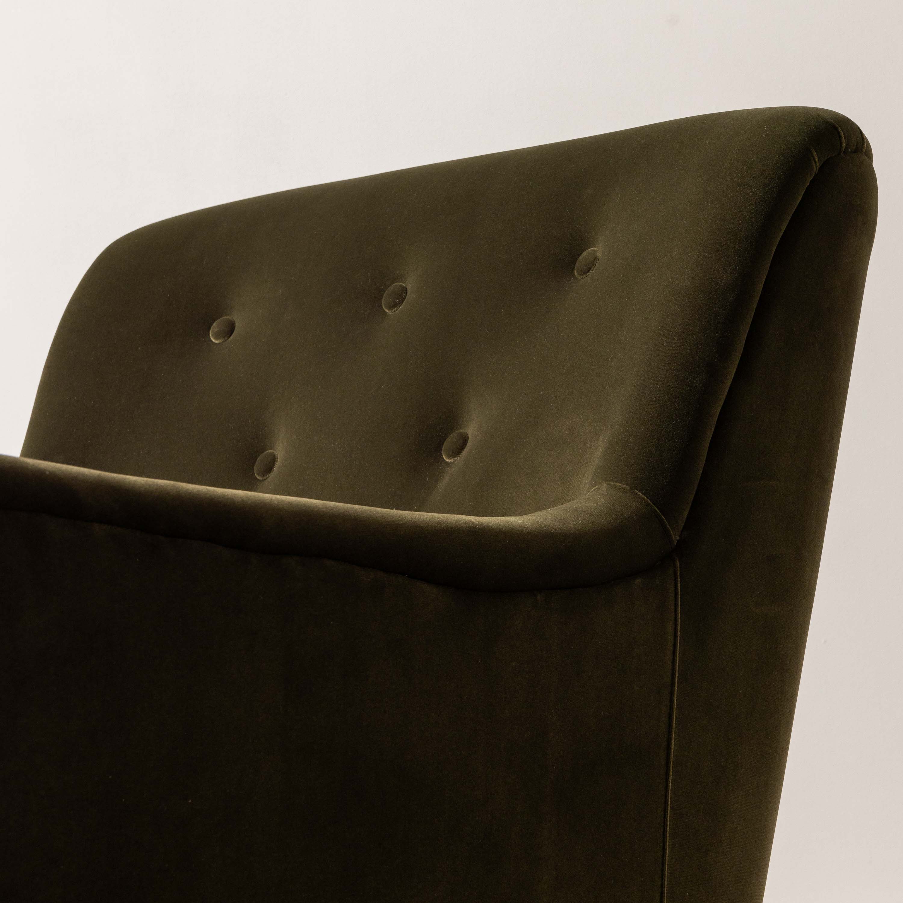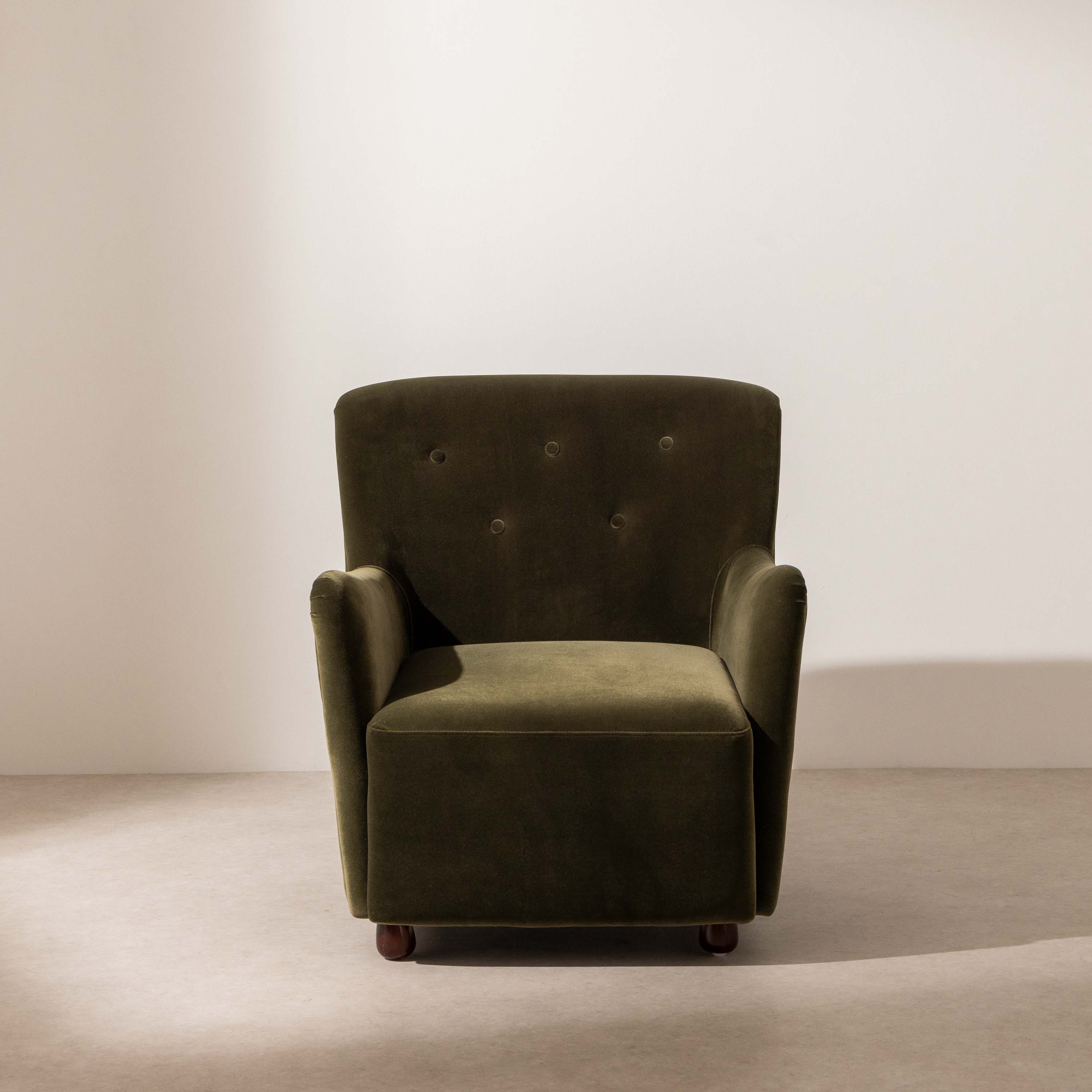 The Verdant High-Back Lounge Chair presents an elegant sculptural silhouette paired with a luxuriously plush seat that beckons you to relax. Supported by beautifully crafted sculptural feet finished in a rich dark walnut stain, this refined accent chair effortlessly combines artistry with comfort.