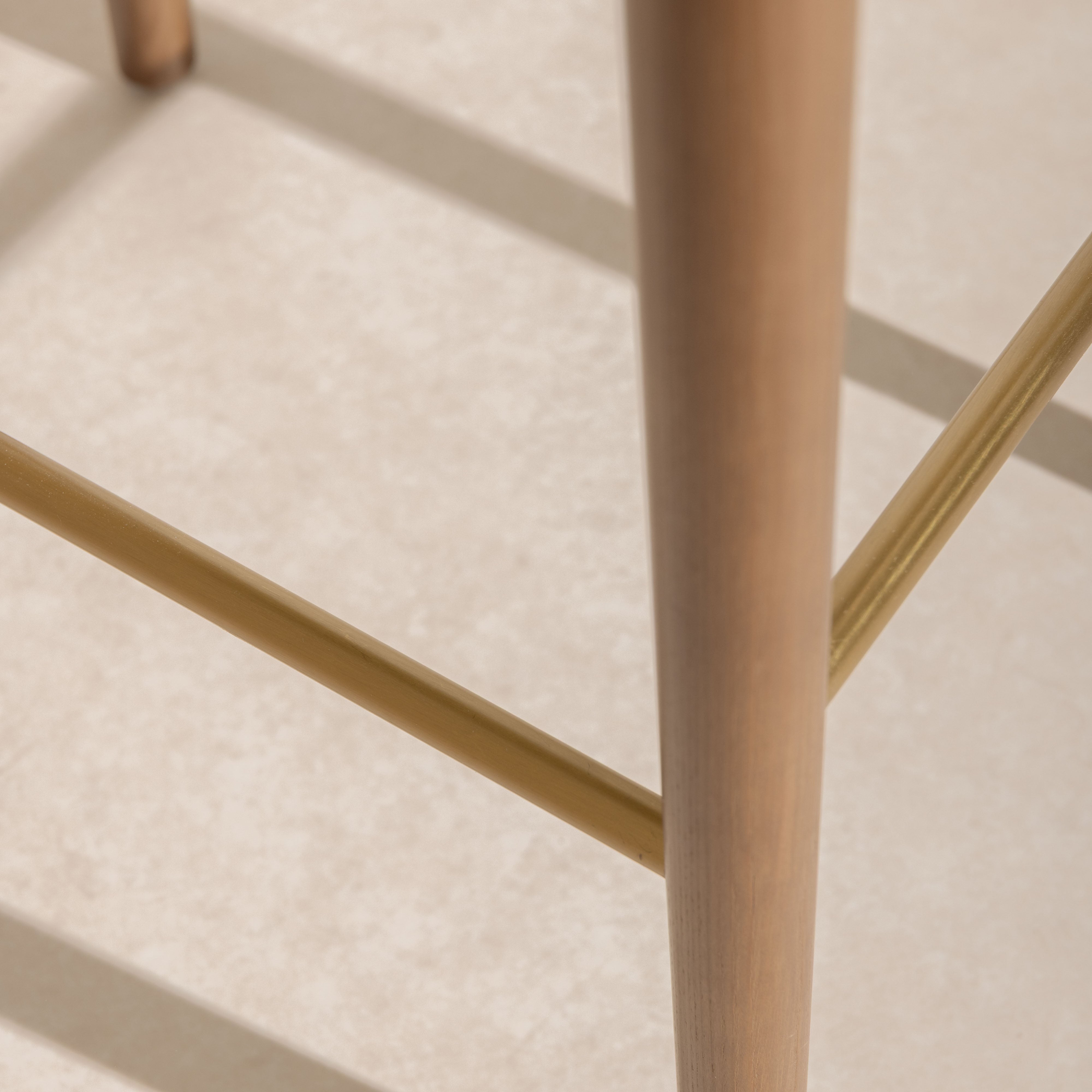 The rich dark oak stain highlights the stool’s exquisite craftsmanship, while the textured canvas upholstery adds tactile depth and visual interest. Complemented by antique brass-effect foot rails, this stool offers a perfect balance of durability and style. Ideal for those seeking a statement piece that enhances both the aesthetic and comfort of any modern interior.