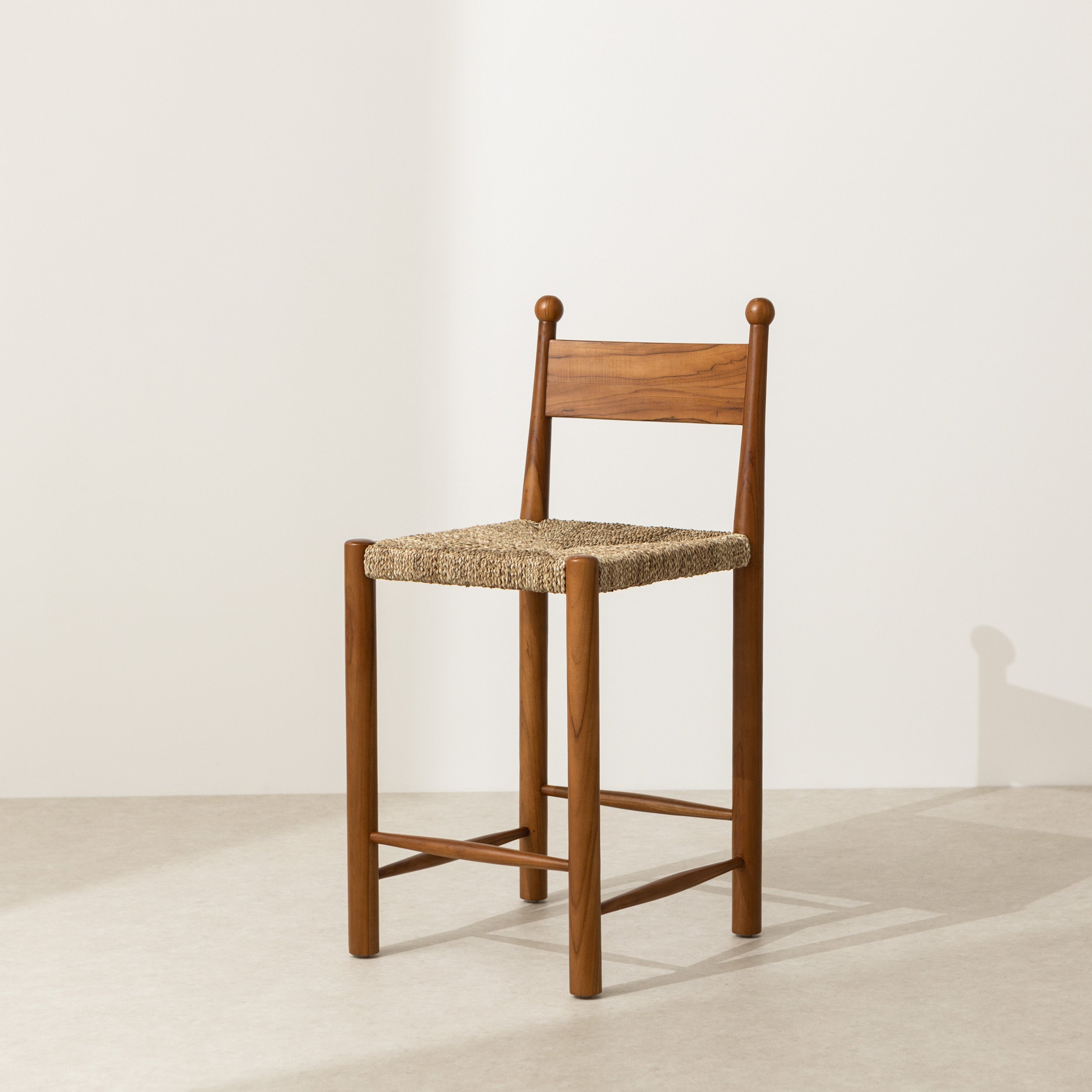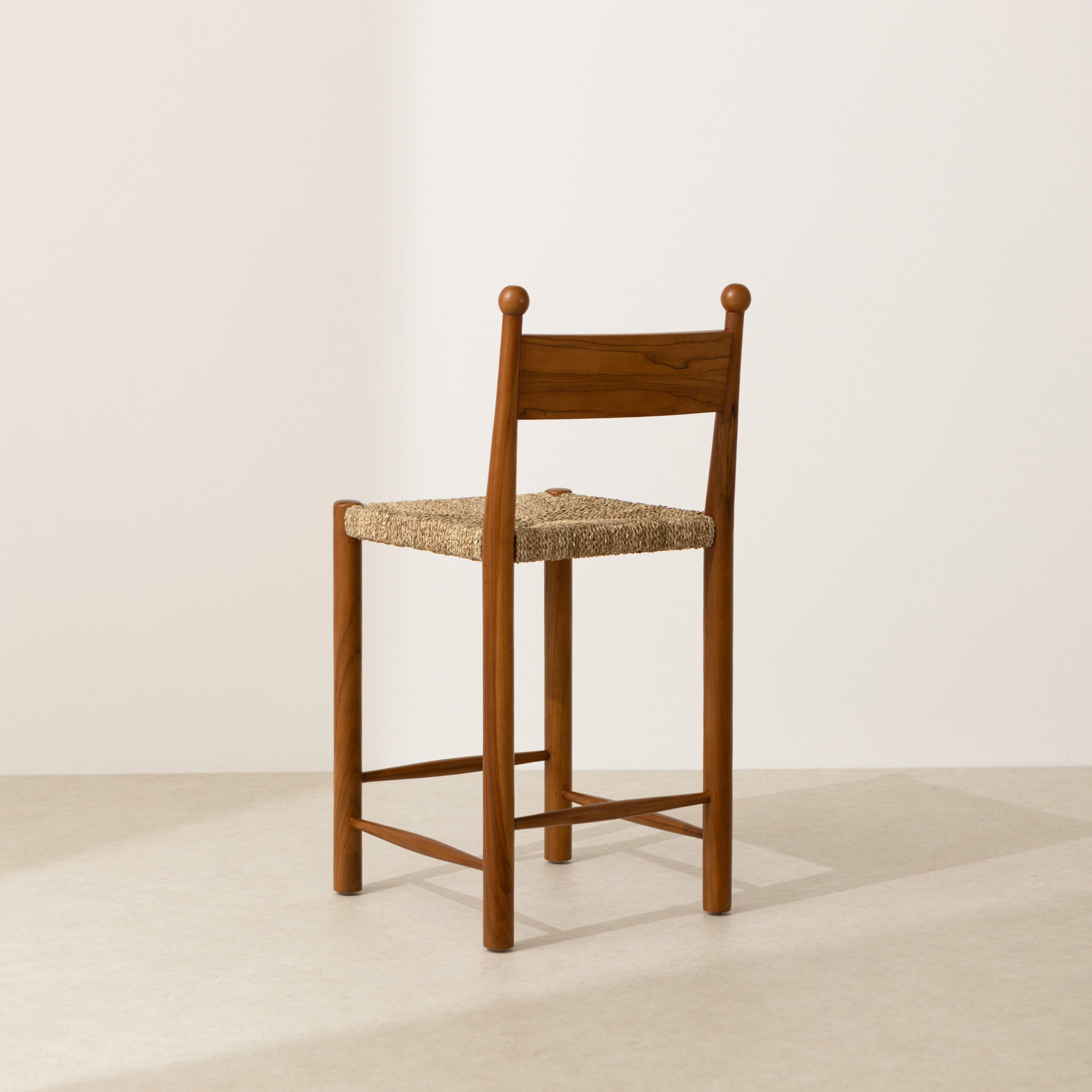 The Bar Stool’s frame is crafted from solid teakwood, featuring finial details on the stool's back. The vintage-inspired detail adds delicacy to the appearance of the stool designed to add an interesting contrast to the textural rope seat.