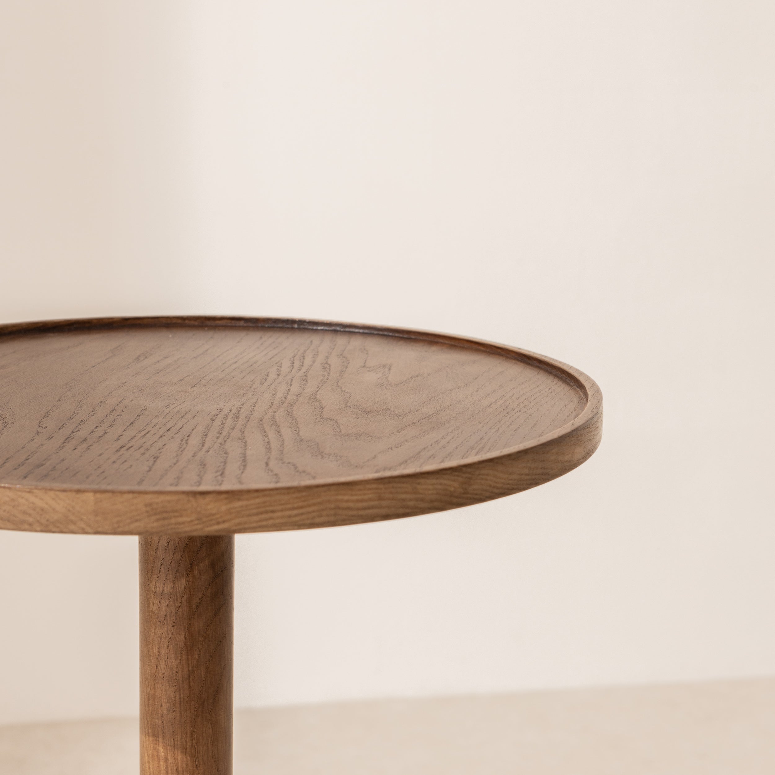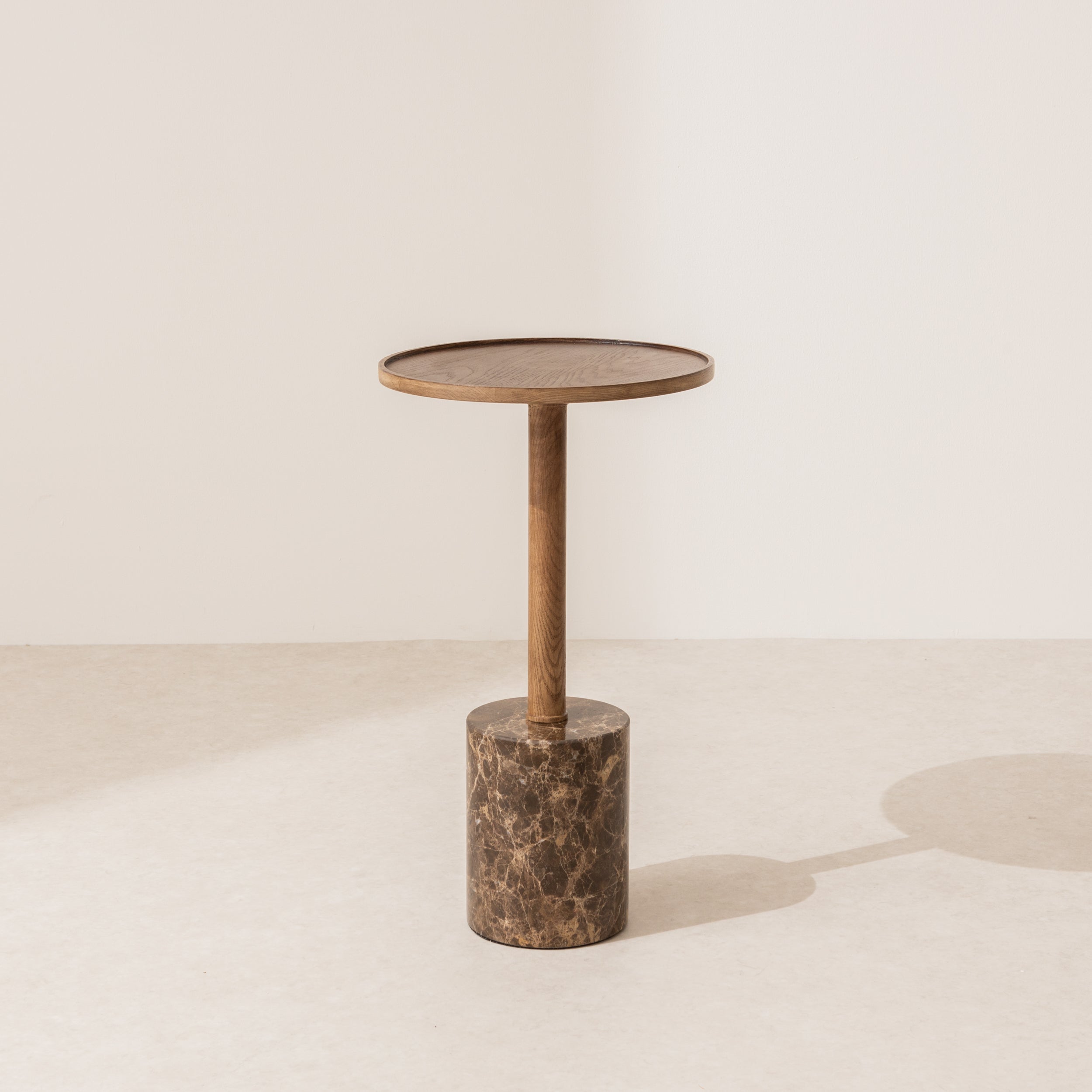 The sleek pole and circular tabletop are manufactured from FSC certified Ash Wood. This sustainable wood has then been stained a rich walnut colour to compliment the warm tones found in the brown marble base.